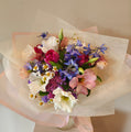Natural looking garden bouquet with great selection of flowers such as Tulips, Lisiantus, Butterfly Delphiniums and Chamomile.
